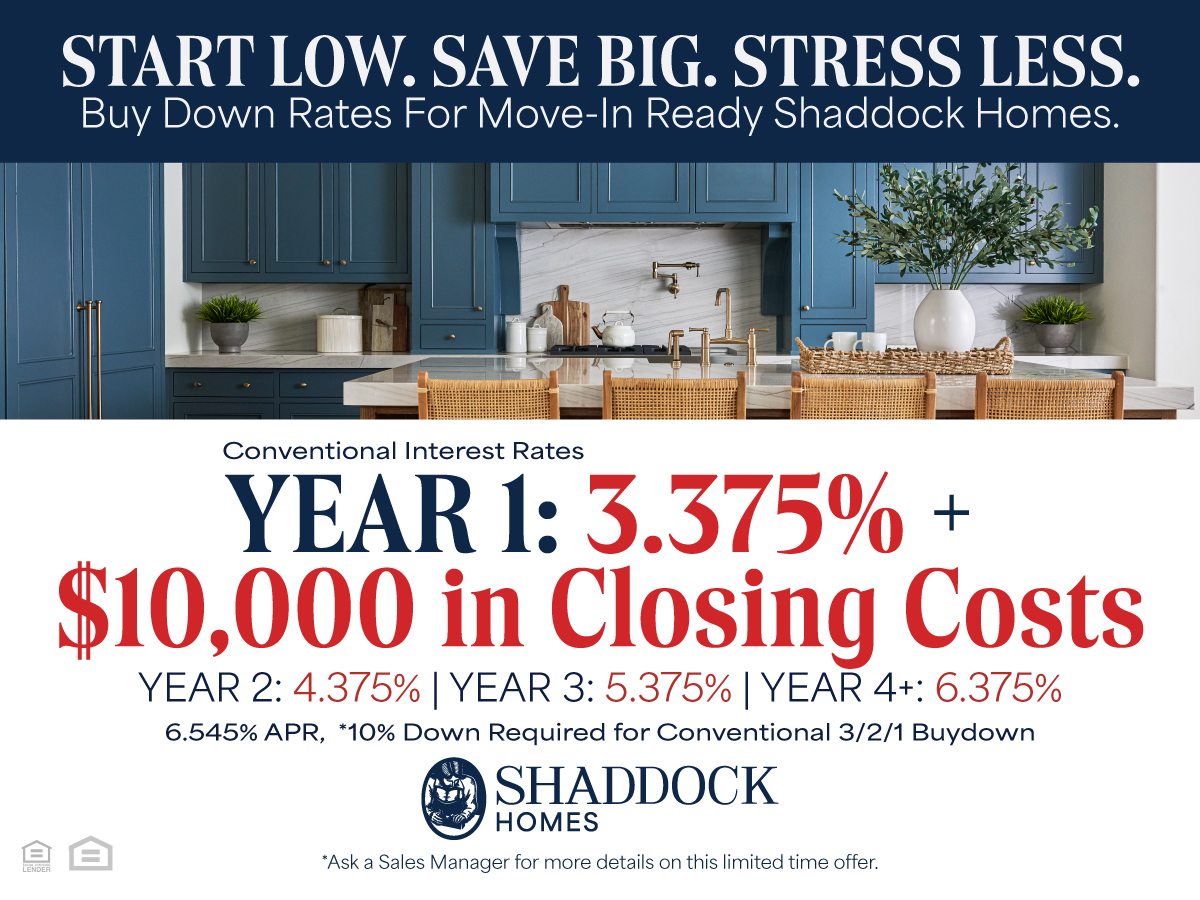 Buy an inventory home with a Convention Loan through Shaddock Homes Mortgage to get this amazing Buydown Rate + $10,000 in Closing Costs. For a limited time only.