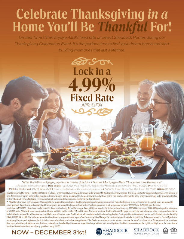 Limited Time Offer! Enjoy a 4.99% fixed rate on select Shaddock Homes during our Thanksgiving Celebration Event. It’s the perfect time to find your dream home and start building memories that last a lifetime.